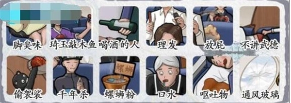 收集12个“不讲武德”的场景/情况:脚臭味、琦玉敲木鱼、喝酒的人、理发、放屁、不讲武德、偷袈裟、千年杀、螺蛳粉、口水、呕吐物、通风玻璃,具体内容可参考下方图片。