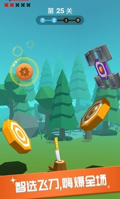 2、在游戏里,把同等级的飞刀进行合成,就能解锁更高级别的飞刀,从而提升战斗力。这款游戏运用了简洁清新的美术风格,带来了舒适的视觉体验。