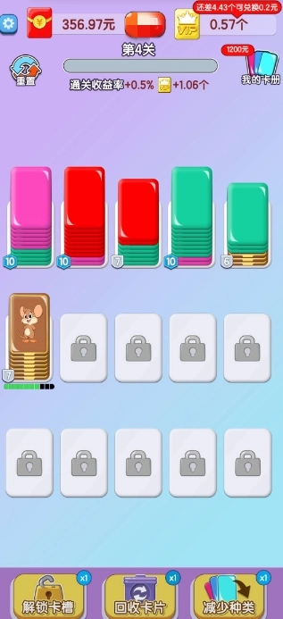 智力大冲关是一款休闲益智类的卡牌堆叠合成小游戏,玩法十分简单——只需通过合成卡片解锁新的红包福利,参与合成挑战,完成关卡即可领取到账的红包福利。这也是一款轻松简单的卡片分类消除游戏,在这里,您可以通过点击挪动不同颜色的卡片进行分类,从而收获并赚取红包。