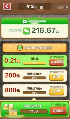 完成2关,可提0.21元,钱款会立即到账微信零钱!付款商户显示为“极速奖励”。