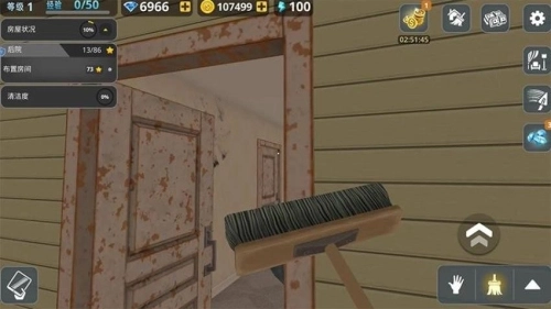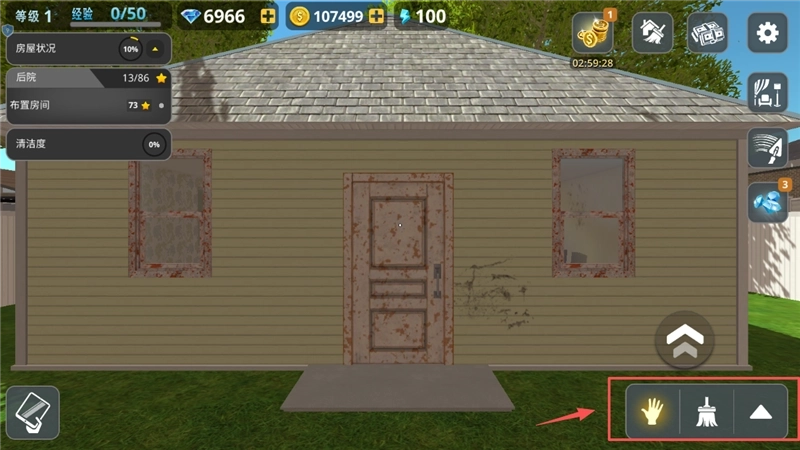1、先进入游戏主界面,映入眼帘的是一座等待翻新的老房子。你可以从左上角看到自己的等级、钻石金币数量以及电量,之后点击右下角的手型或者刷子图标。