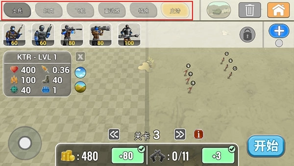 2、首先玩家可以挑选合适的士兵、坦克、飞机、重武器以及史诗级武器等参与战斗,这些单位各有其属性特点,玩家可以仔细斟酌选择。
