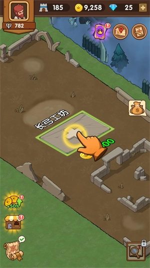 1、进入游戏后点击空白地面上的+号来修建工坊。