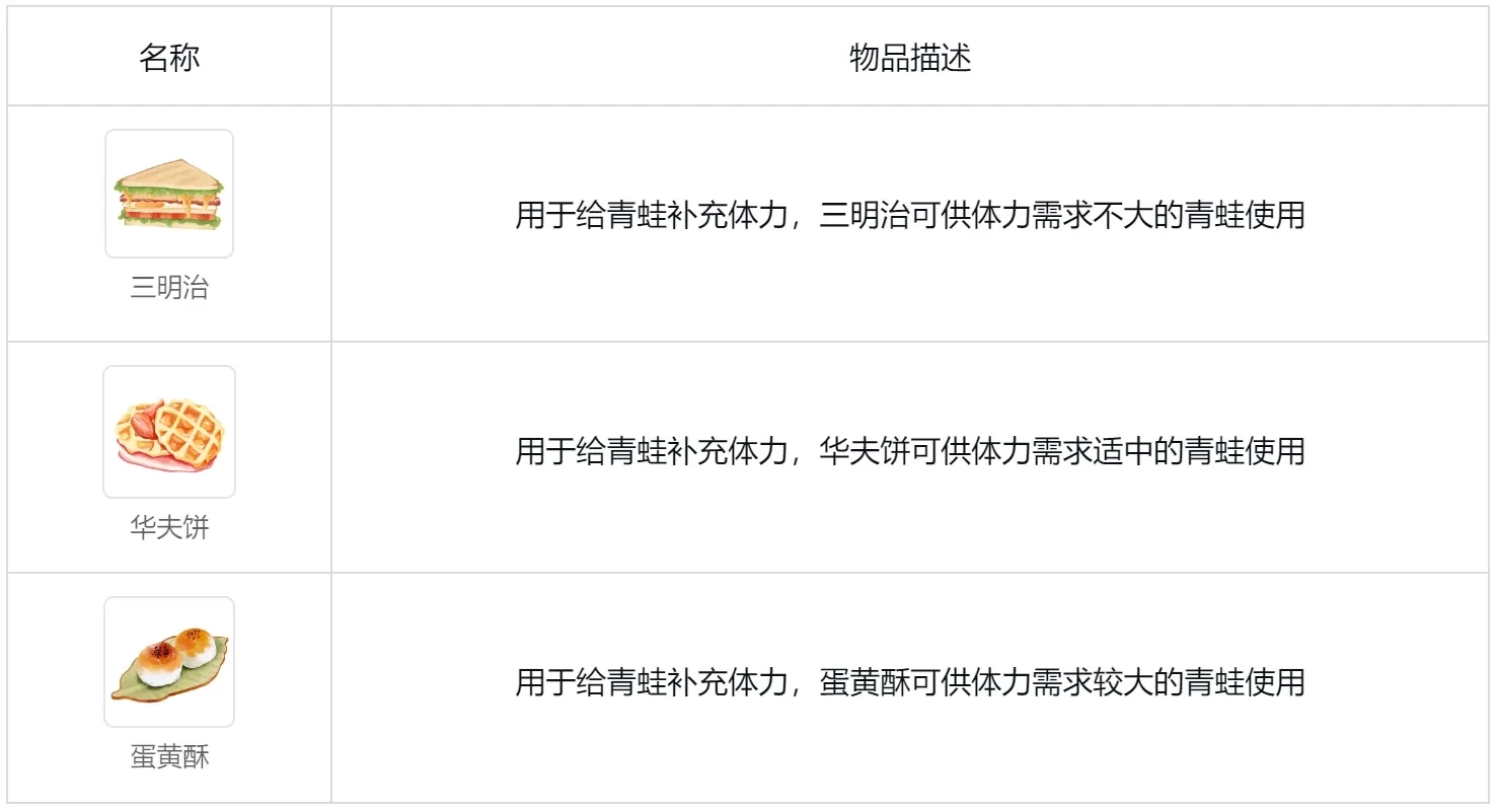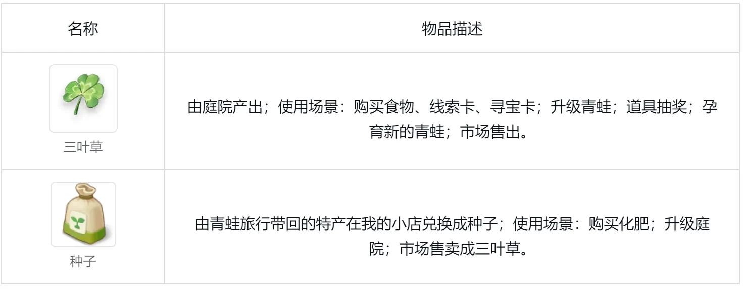 三叶草:在庭院中通过播种和施肥培育后收获获得。它的用途包括:1. 用于购买食物、线索卡以及寻宝卡;2. 可对青蛙进行升级操作;3. 能够参与道具抽奖活动;4. 助力孕育新的青蛙。