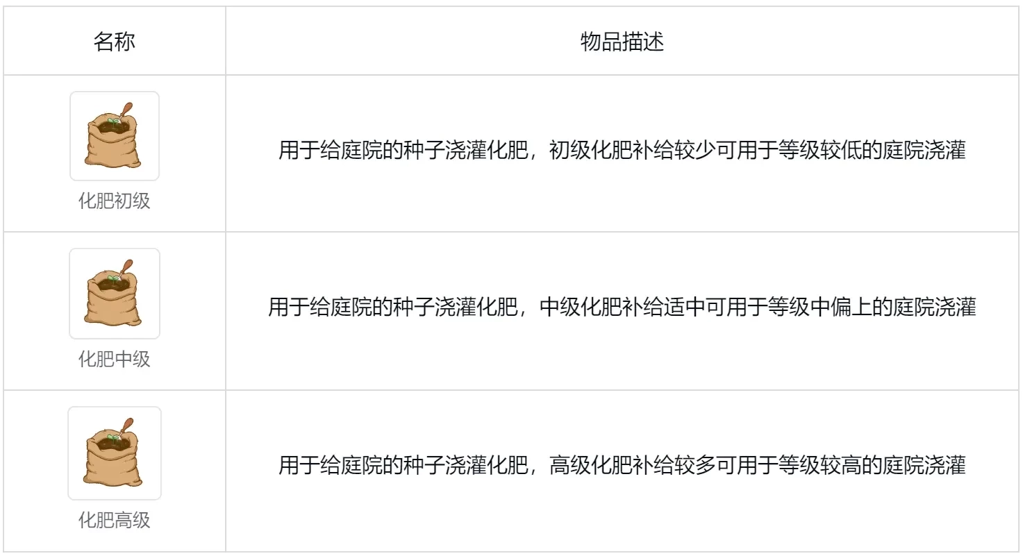 种子:通过青蛙旅行带回的特产兑换获取,用途包括:1. 在庭院中进行播种;2. 用于购买化肥;3. 在市场上售卖以换取三叶草。