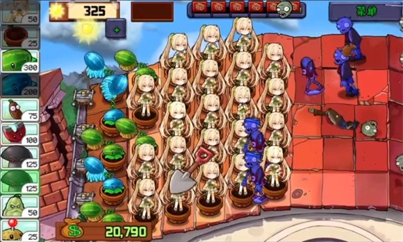 尽量在第一波僵尸出现前种好一列西瓜投手,要是感觉防线快撑不住了,就用毁灭菇来解围。