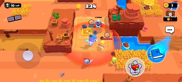 和一个朋友组队对抗其它三个队伍。收集到最多宝石的队伍获胜。获胜队伍分享战利品,失败也能得到。有任务、表情、皮肤、5v5、排名模式。所有角色都有特殊技能。