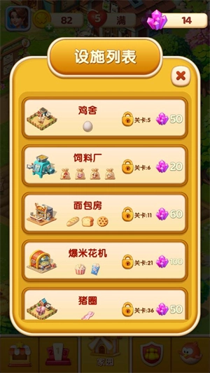 有大量的农场设施正等待你去解锁,通过的关卡数量越多,能够解锁的设施也就越丰富多样。