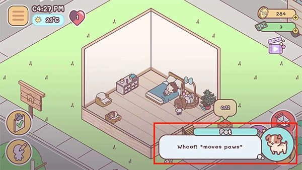 4、回到袖珍爱情游戏界面后,点击宠物,就能看到右下角弹出宠物的对话框,这便是袖珍爱情里与宠物打招呼的方式了。