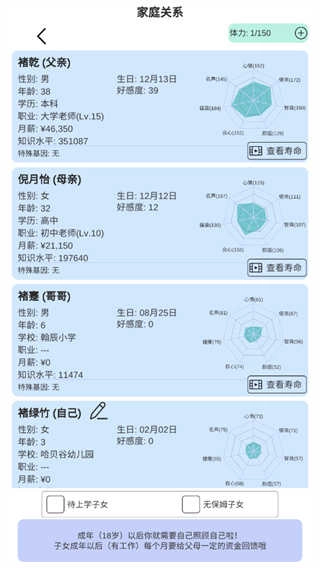 3、接着在主界面里,玩家能够看到自身的名声、兴趣、智商等属性,也可以查看相关的事件。