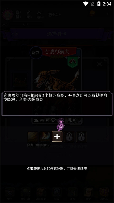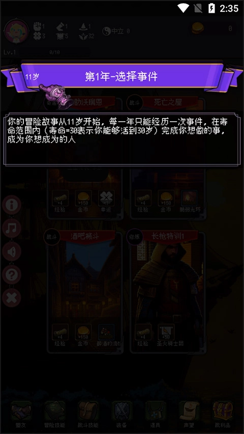 2、初始的冒险属性与金币会直接左右你在人生中遇到事件的结局。点击属性图标,就能查看详细说明,从而合理规划成长路径。