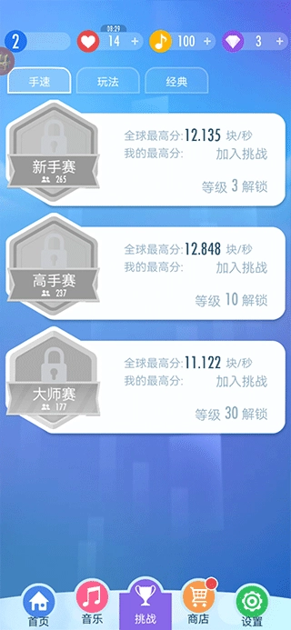 2、完成热身之后,我们点击下方的【音乐】界面,就可以看到许多背景音乐可供我们选择,玩家在游戏过程中会积累经验值,达到一定经验值就会升级,每提高一个等级,会获得许多奖励包括歌曲,钻石,金币等。