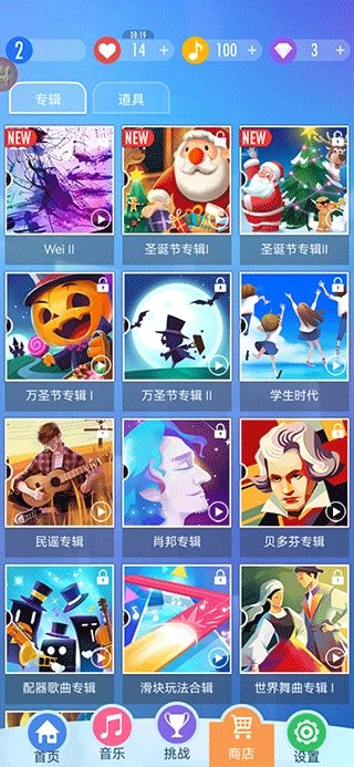 4、当玩家想要更多的歌曲,或者需要购买道具时,点击下方的【商店】,就可以购买自己喜欢的歌曲啦!大部分歌曲用钻石就可以购买。但是道具是需要氪金购买的,不过我们也可以在平常的游戏中免费获得道具,例如做任务,升级等,当然如果你是土豪就不用在意啦!