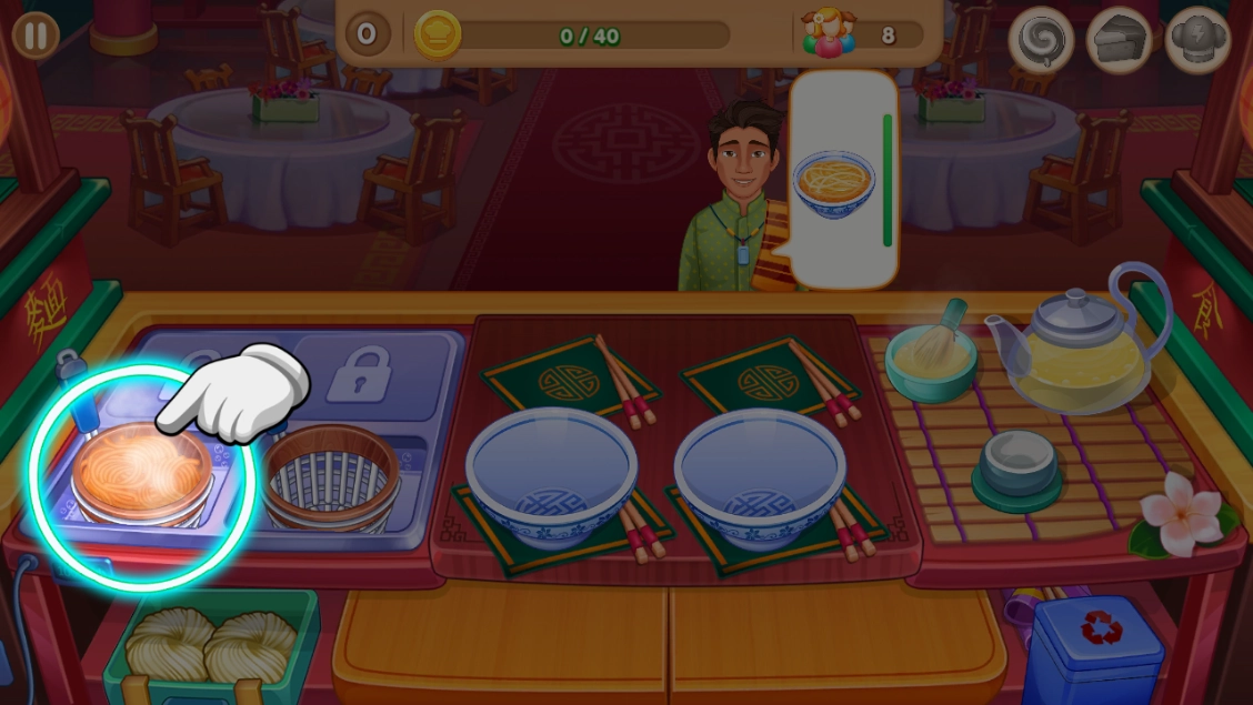 2、之后是教学关卡,我们迎来了第一位顾客,他旁边的气泡显示的就是他点的餐;然后玩家依据教学点击左下角面团,即可开始烹饪面条;