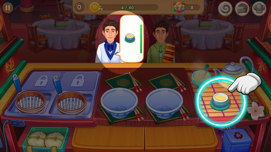 7、每位顾客就餐后都会支付金币,当玩家收集到足够的金币即可顺利过关,顺利过关后还可以获得奖励;