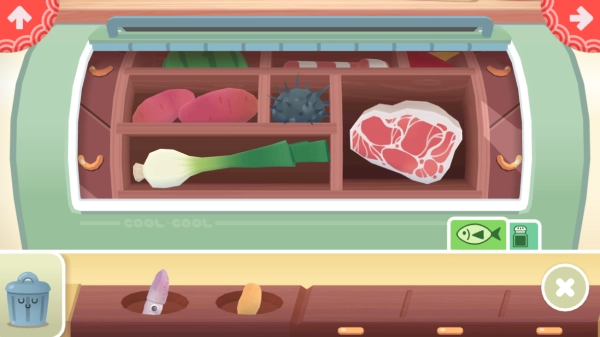 2、进入游戏后,点击下方的冰箱,滑动下图这个地方,会出现大大小小的材料,蔬菜也好海鲜也罢,任君挑选;反正材料无限供应,没有目标的时候随便拿就好;