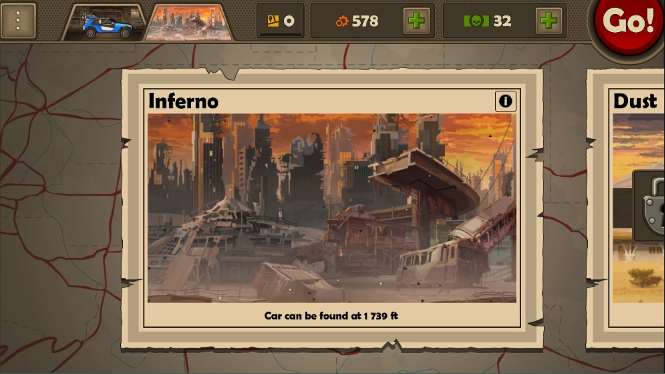 1、进入战车撞僵尸3最新版原版游戏后,选择自己喜欢的赛车进行畅玩