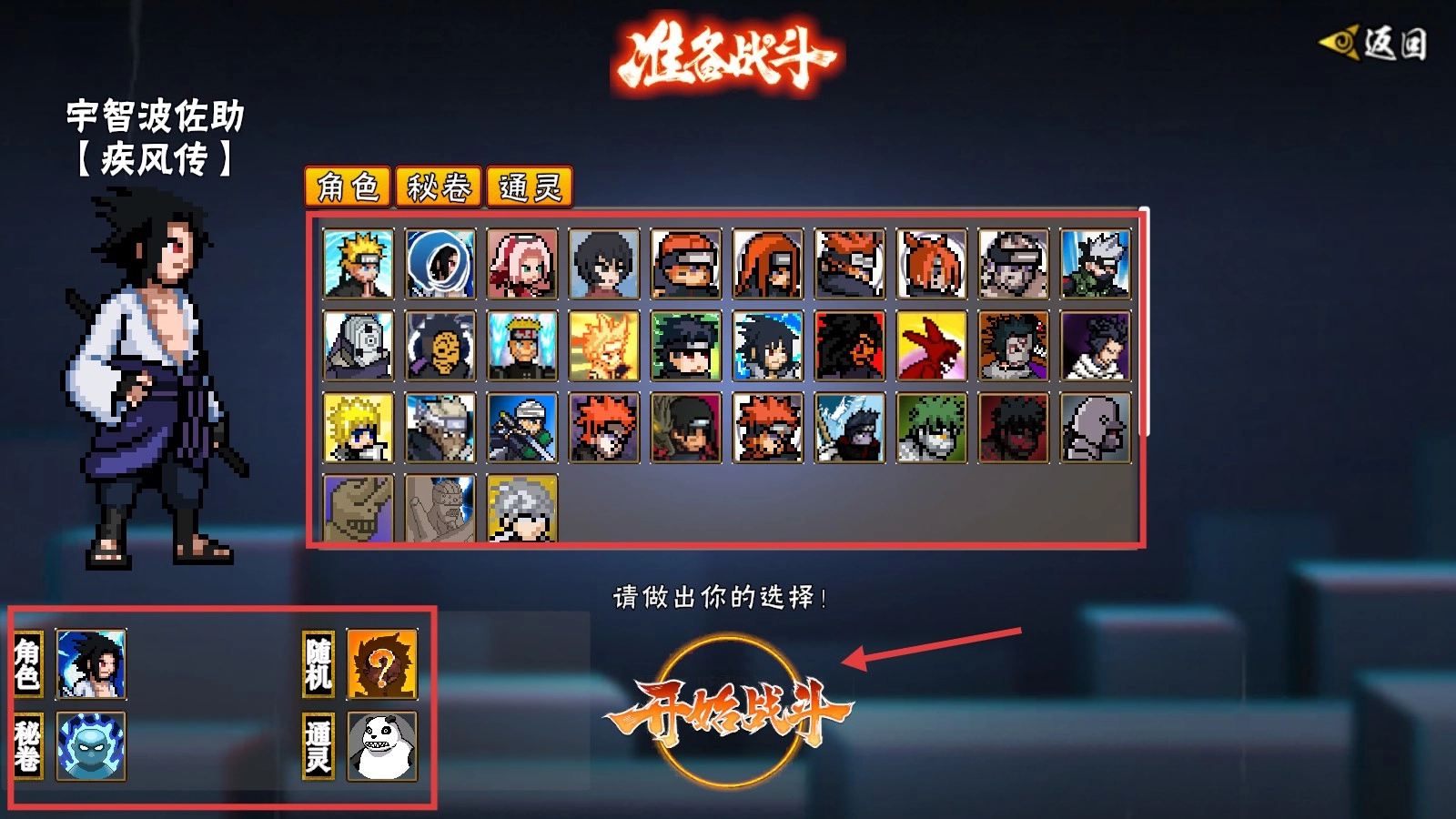 2、进入角色选择界面后,挑选自己喜欢的火影角色,搭配好秘卷与通灵,接着点击【开始战斗】按钮。
