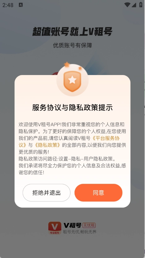 用户首先在3G游戏网V租号平台,查看并同意隐私政策和用户协议。