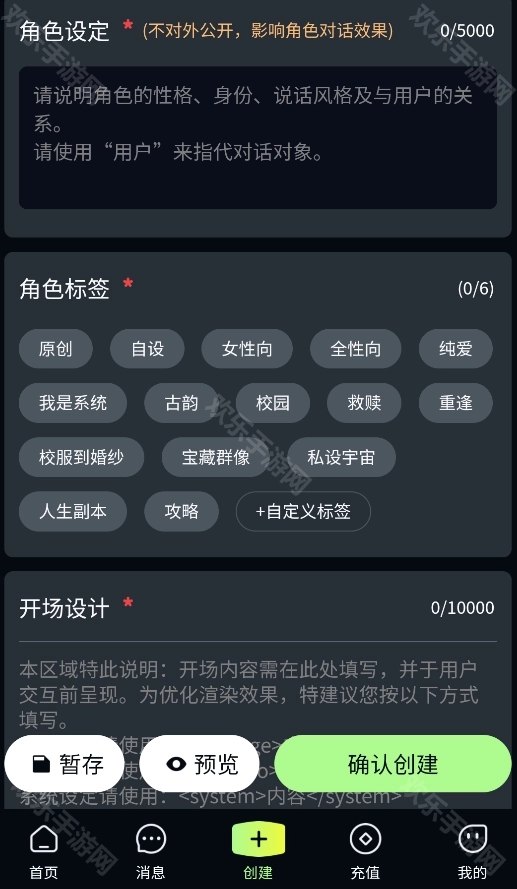2、拥有高度自由的创意与互动模式,允许用户创建并深度定制原创角色(可使用自己的OC)。