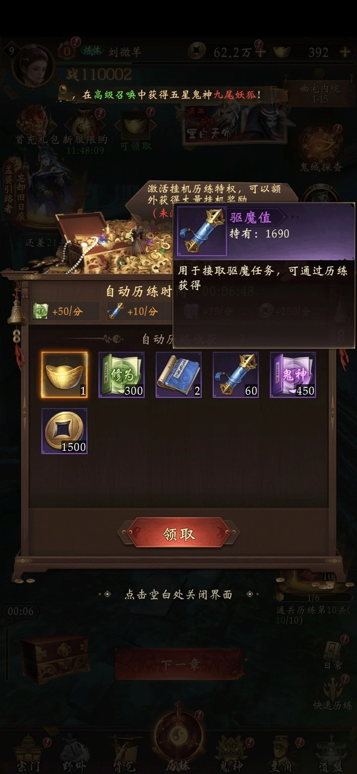 小窍门:升级想更快的话,可以先推进地图关卡,之后再领取挂机积累的经验和使用快速历练功能哦。