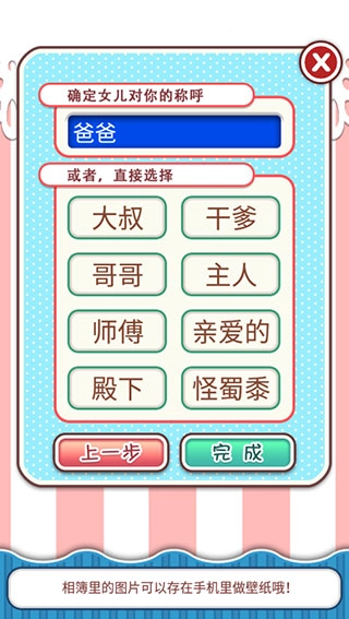 你还能决定小女孩对你的称呼,像大叔、干爹、哥哥、主人、师傅、亲爱的这类选项都可以选。