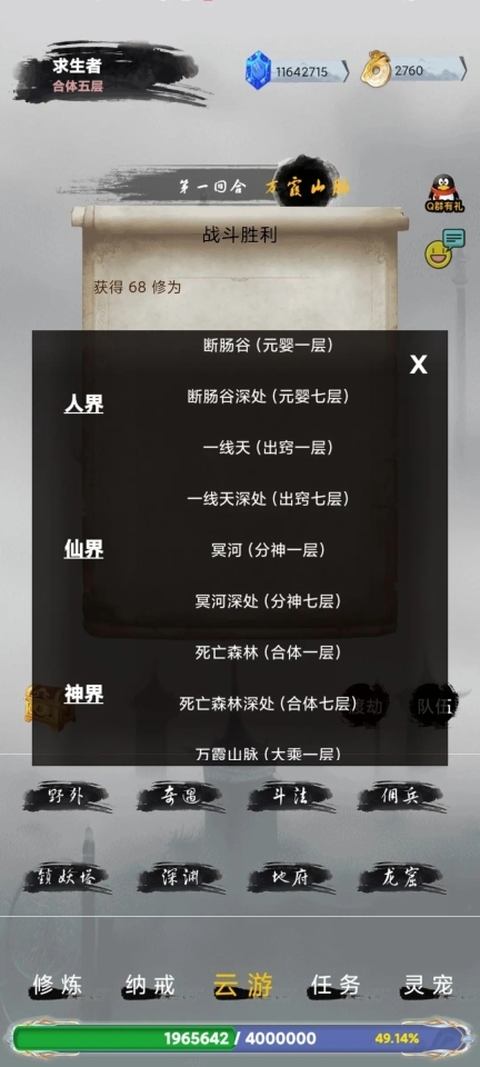 ③当等级达到金丹时,剩下约500仙玉,可在云游界面打开奇游。奇游每天有10个奇遇,有几率在其中买到低价丹药产品。(个人强烈推荐,每天来这里逛一逛,之后再去黑市。)