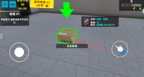 进入游戏后,你需要借助虚拟摇杆来控制角色移动到货物附近,然后点击盒子完成取货操作。