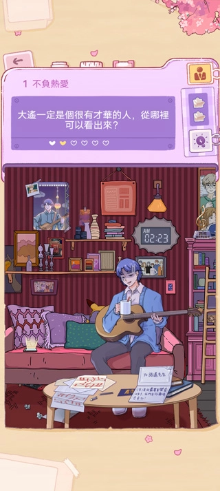 在游戏里,你会化身名叫木子的女孩,和另外两位女生、三位男生一起住在同一栋房子里,开启合租生活。游戏初期可以选择领养一只萌萌的小狗,虽然它在主线剧情里没什么大作用,但在支线任务中能带着它去散步,玩法有点像简单的2D跑酷,得操控小狗跳跃来避开障碍物。散步途中会经过游乐园、路边小摊等各种地方,玩家要帮角色回答问题,以此提升狗狗的属性。虽然这部分内容相对独立,但要是能和主线剧情结合起来,会更有吸引力。主线剧情主要围绕房屋布置、角色之间的互动以及恋爱关系展开,玩家可以通过对话去探索六位角色之间的感情线,分析他们各自的性格特点,进而深入了解剧情,获得丰富的沉浸式体验。