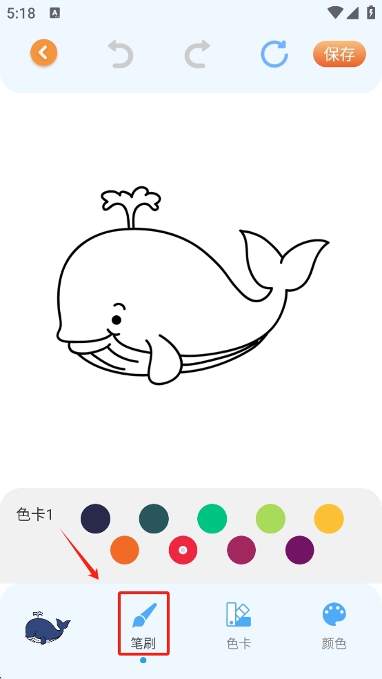 3、点击选中的图案后,会进入填色界面,在这里你可以挑选颜色和笔刷,接着就可以开始给图案上色了。
