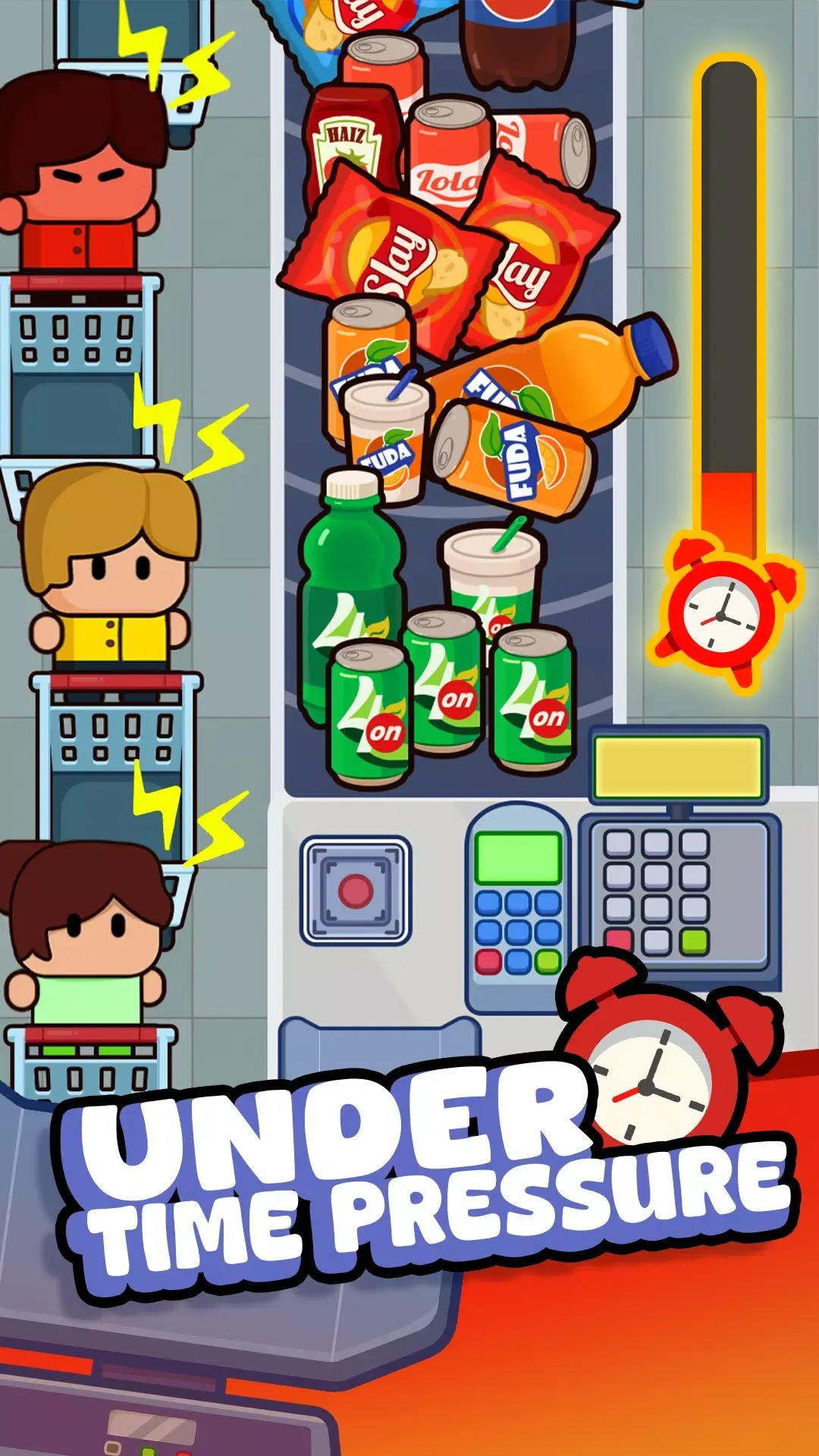 1、游戏画风卡通,给玩家带来舒适的视觉体验,非常现实的收银流程。