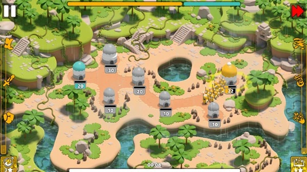 1、游戏开始时,你会拥有一座或多座屯有兵力的堡垒。你的目标是占领那些未被开拓的堡垒,逐步囤积士兵,运用谋略与智慧消灭其他敌方士兵,从而赢得战局胜利。