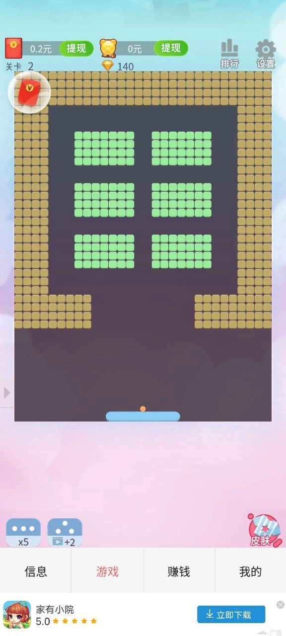 这是一款以打砖块为核心玩法的轻松小游戏,整体内容趣味十足,上手门槛低,游戏过程非常解压。通过滑动屏幕控制横板移动,防止小球掉落,并利用反弹机制击碎砖块即可完成挑战。