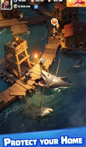 3、要小心躲避形形色色的海怪,还得消灭大量凶猛的鲨鱼怪物,以此守护避难所的安全。