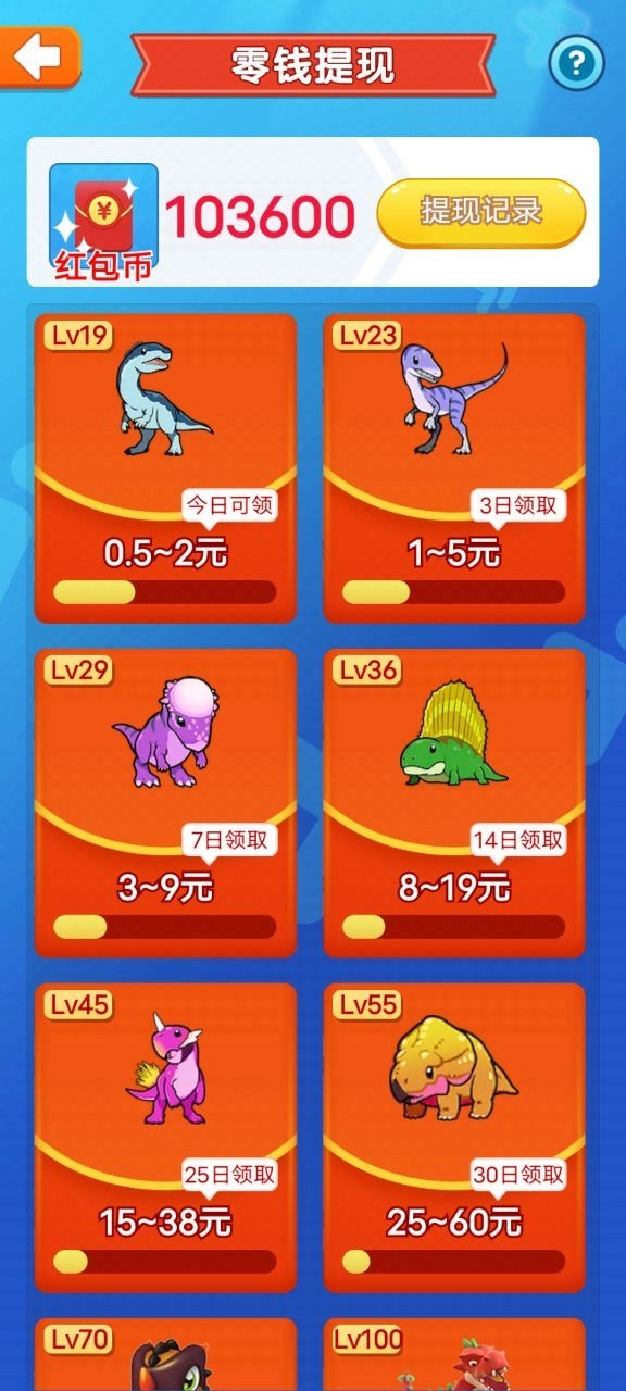 3、不断开展收藏与合成操作,就能培育出更多类型的恐龙,每次升级都可领取红包。