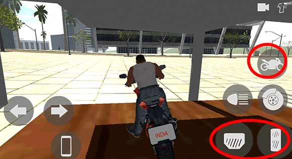 2、通过控制摇杆让人物走到房子外骑上摩托车,点击左右两侧的功能按钮控制车辆。