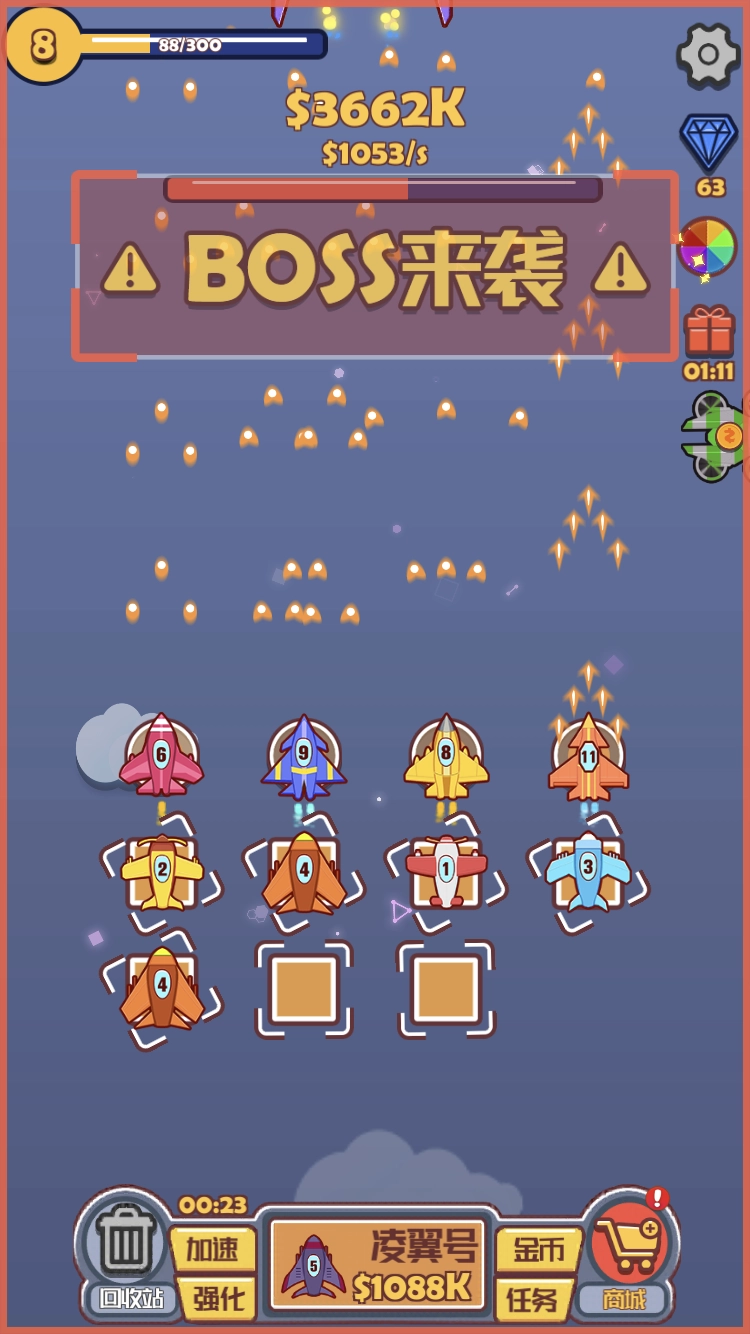 2、在应对不同Boss时,要想更具优势,得先提升战机等级才行