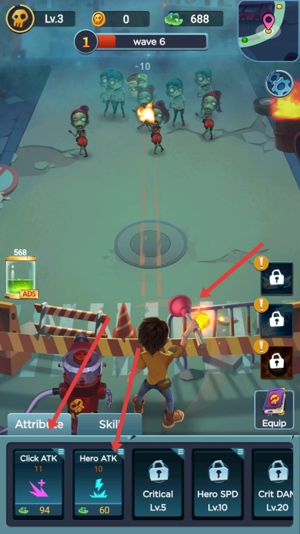 3、在战斗过程中,点击下方技能栏里的技能,再配合点击攻击,就能对袭来的多只僵尸造成伤害,从而提升战斗效率。