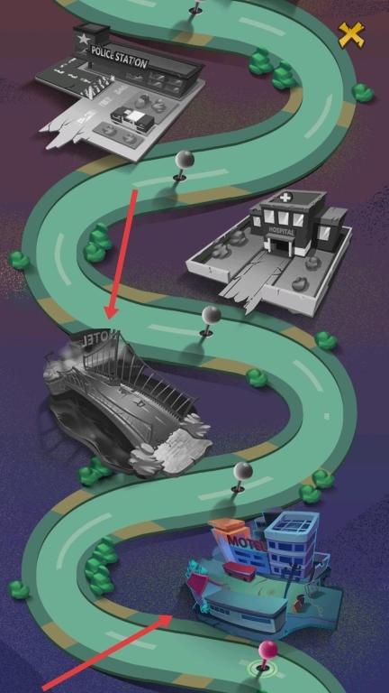 在战斗的间歇期,可以打开关卡地图,挑选不同的关卡场景来推进进程,前往警察局、医院等各类地点的关卡继续进行挑战。