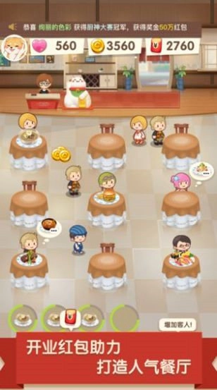 在这里玩家可以自由招募各类厨师和工作人员,以此赚取jin币来兑换红包。