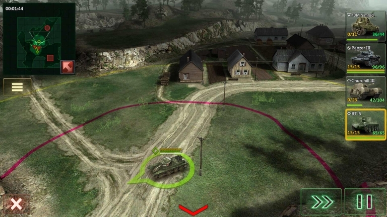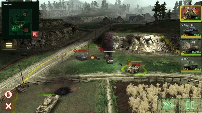 玩家能够拖动地图上的任意一辆坦克来移动,接着选定目标发起攻击。当然,每辆坦克都有其独特之处,例如有些坦克尽管攻击力较弱、攻击范围不大,但移动速度比较快,而且侦察范围很广,适合在队伍前方进行探路。