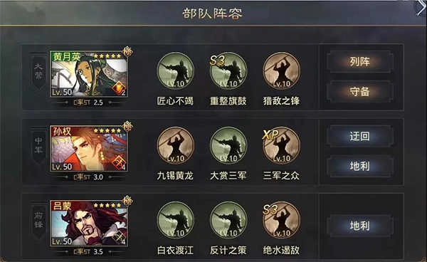 2、在部队配置界面,把处于闲置状态的武将拖拽到“大营”“中军”或者“前锋”的位置上,替换掉原来的武将后点击“返回”按钮,就完成了部队编组。要留意的是,同一部队里,如果武将属于相同兵种、同一阵营,或者有特定称号组合,就能获得属性方面的增益效果。不同武将的技能特点以及攻击距离都存在差异,所以武将的搭配方式和站位安排十分关键。建议把同阵营的武将,或者拥有特定称号的武将安排在同一支部队中,并且依据兵种的特性来进行合理的布局。比如,可以让骑兵担任前锋去冲锋陷阵,而弓兵和步兵则部署在中军和大营,承担远程输出的角色。但需要注意的是,在组建单一兵种的部队时,要关注兵种之间的相克关系,像弓兵克制骑兵,骑兵克制步兵,步兵又克制弓兵。