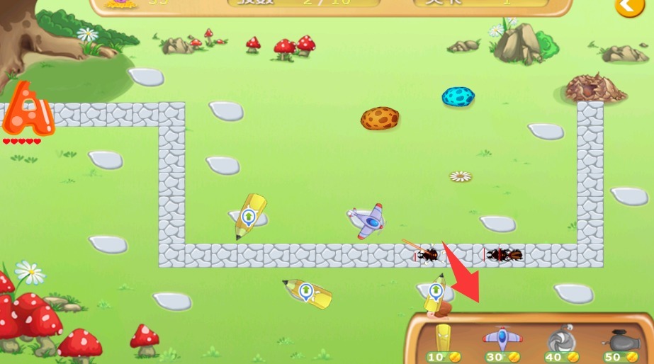 4、在空地上放置武器来攻击蚂蚁,只有合理布置武器,才能守住字母不被它们抢走。