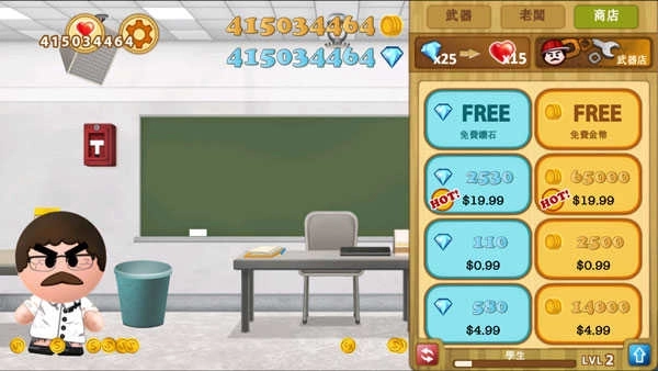 右上角的武器商店时刻准备着,购入新装备后就能瞬间变身为办公室战神。