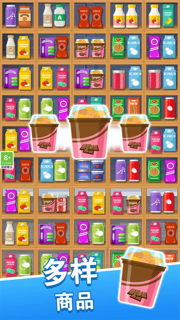 2、独特的消除玩法,通过移动和堆叠容器,匹配相同的物品来消除积分;