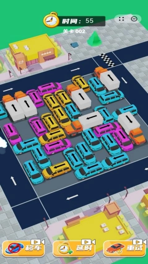 4、运用逻辑思维进行全面规划,特别是细节之处需反复斟酌,将所有车辆移出停车场方可通关。