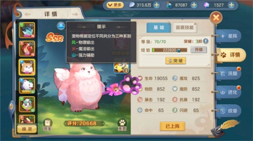 3、?随着等级解锁,宠物星阵也会同步开启。一人携带三只宠物不再是遥不可及的梦想!三只宠物能够轮流上阵,自由切换,堪称“四打一”的强势阵容呢~~另外,大家是否留意到宠物左上角的小标识?每只宠物都自带属性,依据不同定位共分为三种系别:风系对应物理输出、火系对应魔法输出、山系对应强力辅助。