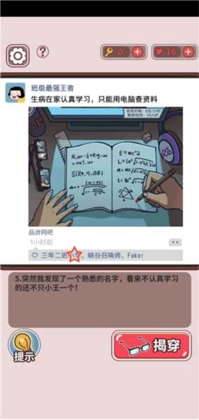 第五关的操作步骤如下:首先点击品游网吧,接着点击电脑上显示的会员时间,然后点击桌子上眼镜的镜面,再点击男孩手中的笔头,最后点击三年级二班小李所点的赞。