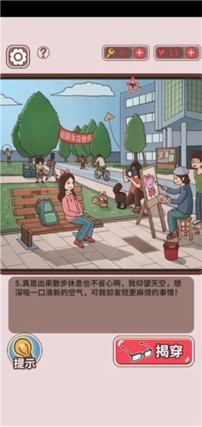 第十二关:点击最后面手牵手的两位同学,点击绿衣服同学背着的伞,点击撑五角星伞的男女同学的情侣鞋,点击脚印,点击操场女生的裤腿,即可过关。
