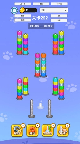3、将全部颜色相同的螺母整齐排列,就能通关。